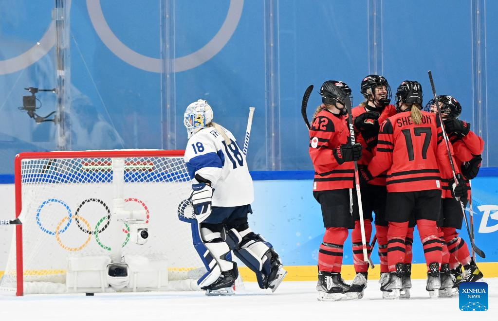 Atheletes of Canada celebrate during the ice hockey women's preliminary round group A match between Canada and Finland at Wukesong Sports Centre in Beijing, capital of China, Feb. 5, 2022. (Xinhua/Ma Ning)