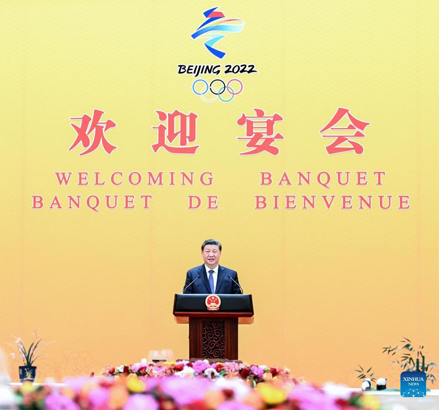 Chinese President Xi Jinping gives a toast at a banquet to welcome distinguished guests from around the world who attended the opening ceremony of the Beijing 2022 Olympic Winter Games in Beijing, capital of China, Feb. 5, 2022. Chinese President Xi Jinping and his wife Peng Liyuan hosted the banquet at the Great Hall of the People Saturday noon. (Xinhua/Zhai Jianlan)
