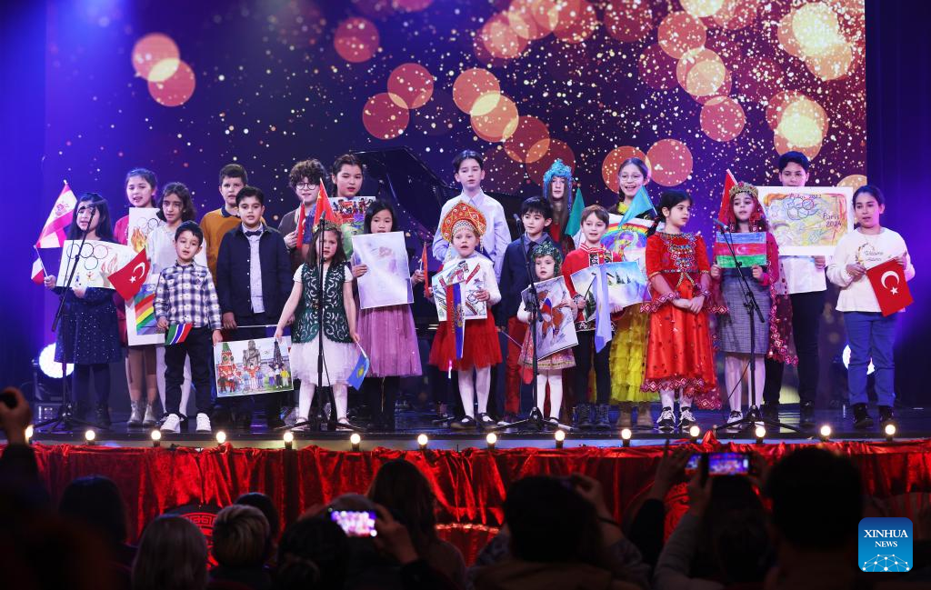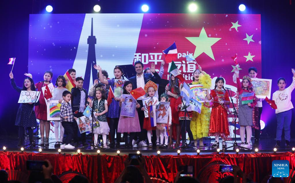 UNESCO children's choral group performs during the recording of the "Peace, Friendship, Love" concert at Theater du Gymnase Marie Bell in Paris, France, Jan. 26, 2022. On the first day of the Year of the Tiger, a special program dedicated to the Beijing Winter Olympic Games and Paris 2024 Olympic Games was broadcast on France's TV5 Monde on Feb. 1, 2022.