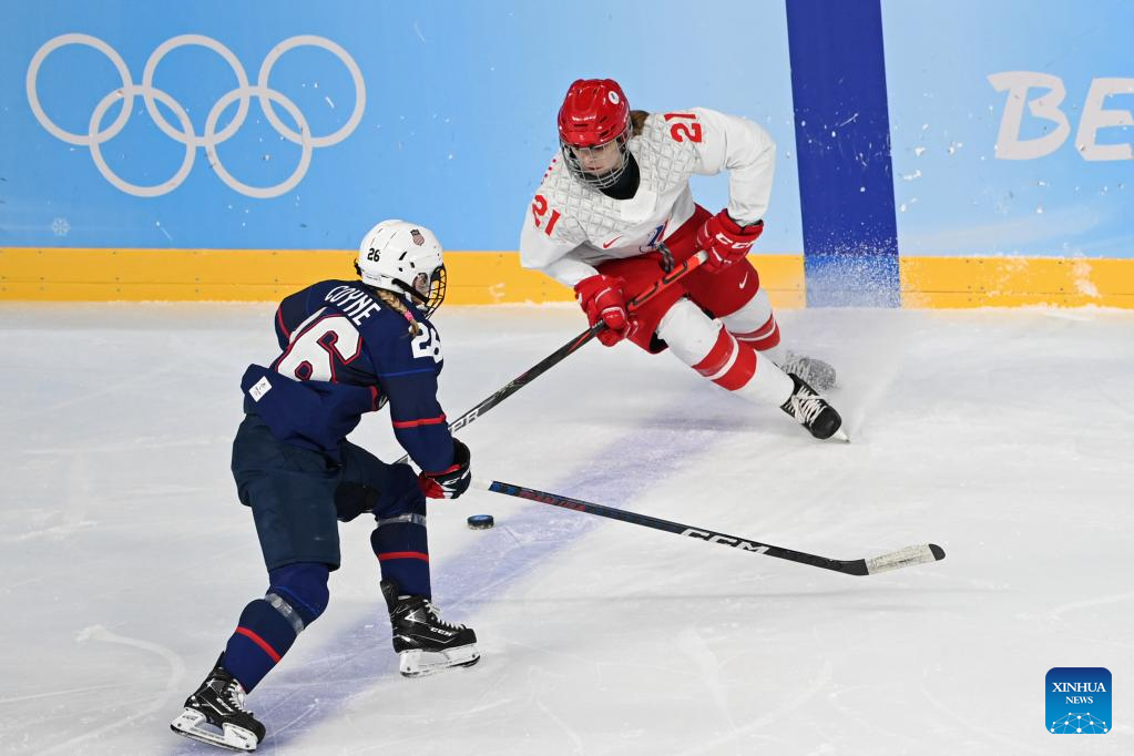 Polina Bolgareva (R) of the Russian Olympic Committee vies with Kendall Coyne Schofield of the United States during the women's ice hockey preliminary round Group A match between the United States and the Russian Olympic Committee at Wukesong Sports Centre in Beijing, capital of China, Feb. 5, 2022. (Xinhua/Huang Zongzhi)
