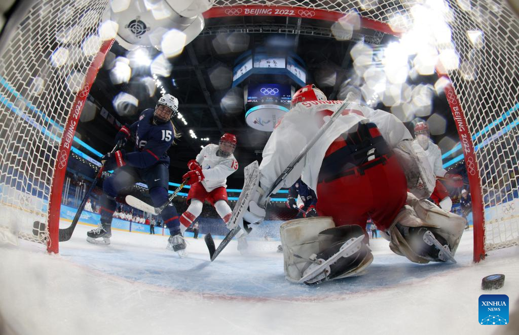 Savannah Harmon (1st L) of the United States scores during the women's ice hockey preliminary round Group A match between the United States and the Russian Olympic Committee at Wukesong Sports Centre in Beijing, capital of China, Feb. 5, 2022. (Xinhua/Song Yanhua)