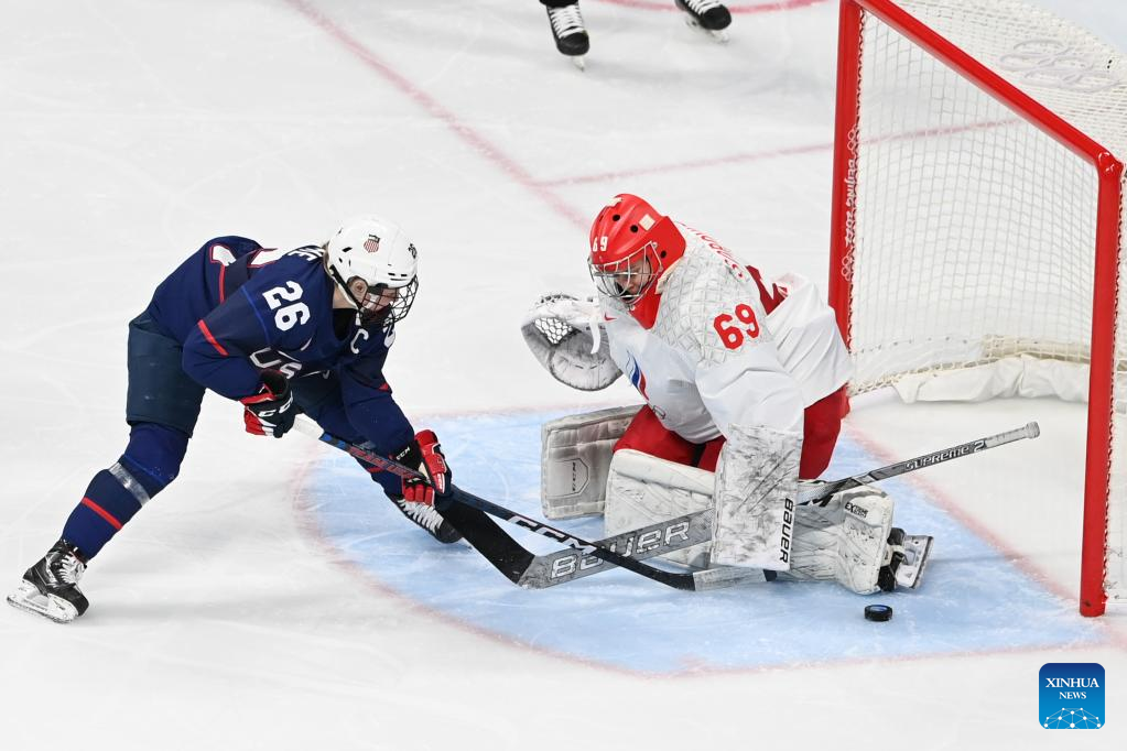 Kendall Coyne Schofield (L) of the United States shoots the gate during the women's ice hockey preliminary round Group A match between the United States and the Russian Olympic Committee at Wukesong Sports Centre in Beijing, capital of China, Feb. 5, 2022. (Xinhua/Huang Zongzhi)