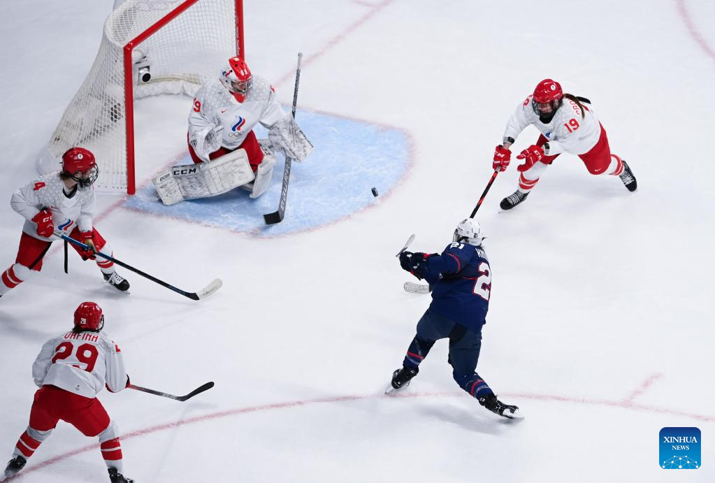 Hilary Knight (2nd R) of the United States shoots the gate during the women's ice hockey preliminary round Group A match between the United States and the Russian Olympic Committee at Wukesong Sports Centre in Beijing, capital of China, Feb. 5, 2022. (Xinhua/Huang Zongzhi)