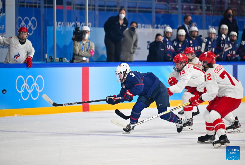 (220206) -- BEIJING, Feb. 5, 2022 (Xinhua) -- Cayla Barnes (1st L) of the United States competes during the women's ice hockey preliminary round Group A match between the United States and the Russian Olympic Committee at Wukesong Sports Centre in Beijing, capital of China, Feb. 5, 2022. (Xinhua/Song Yanhua)