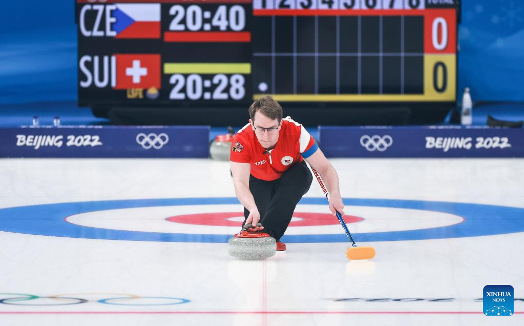 Martin Rios (L) of the Czech Republic and his teammate Jenny Perret compete during the curling mixed doubles round robin session of the Beijing 2022 Winter Olympics between Sweden and Czech Republic at the National Aquatics center in Beijing, China, Feb. 5, 2022. (Xinhua/Liu Xu)