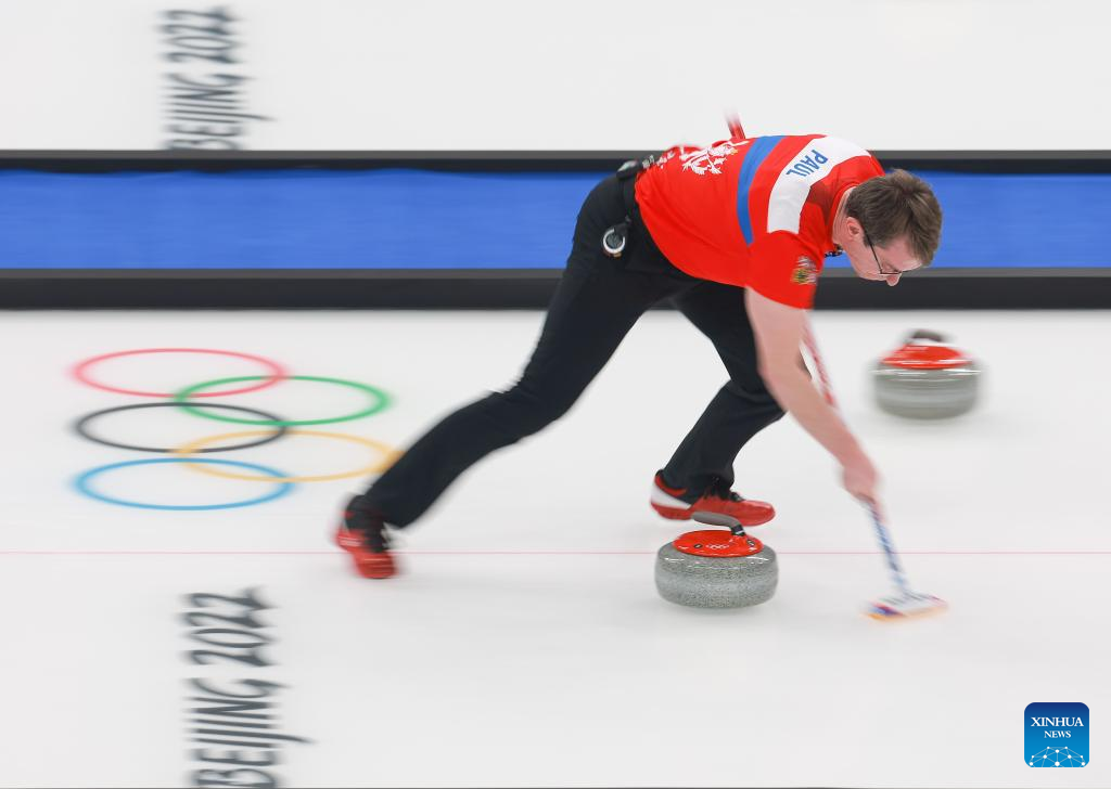 Tomas Paul of the Czech Republic competes during the curling mixed doubles round robin session of the Beijing 2022 Winter Olympics between Czech Republic and Norway at the National Aquatics center in Beijing, China, Feb. 5, 2022. (Xinhua/Liu Xu)