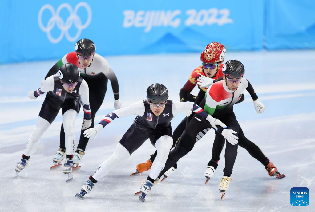 Athletes compete during the mixed team relay semifianl of short track speed skating at Capital Indoor Stadium in Beijing, China, Feb. 5, 2022. (Xinhua/Lan Hongguang)