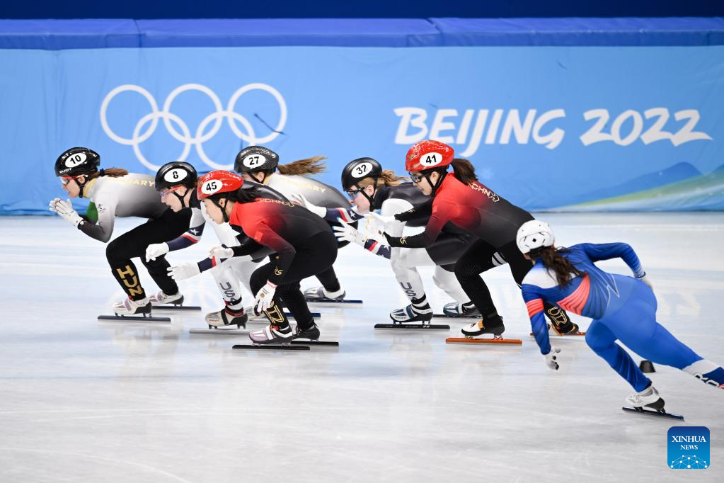 Athletes compete during the mixed team relay semifinal of short track speed skating at the Capital Indoor Stadium in Beijing, China, Feb. 5, 2022. (Xinhua/Li Ga)