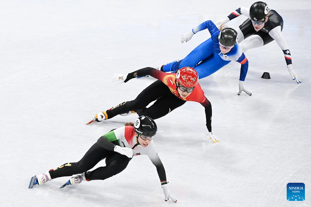 Qu Chunyu (2nd L) of China competes during the mixed team relay semifinal of short track speed skating at the Capital Indoor Stadium in Beijing, China, Feb. 5, 2022. (Xinhua/Xiong Qi)