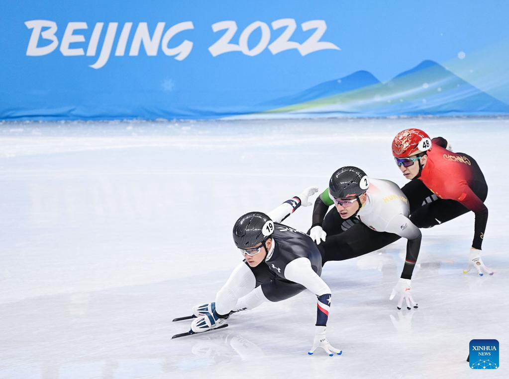 Wu Dajing (R) of China competes during the mixed team relay semifianl of short track speed skating at Capital Indoor Stadium in Beijing, China, Feb. 5, 2022. (Xinhua/Xiong Qi)