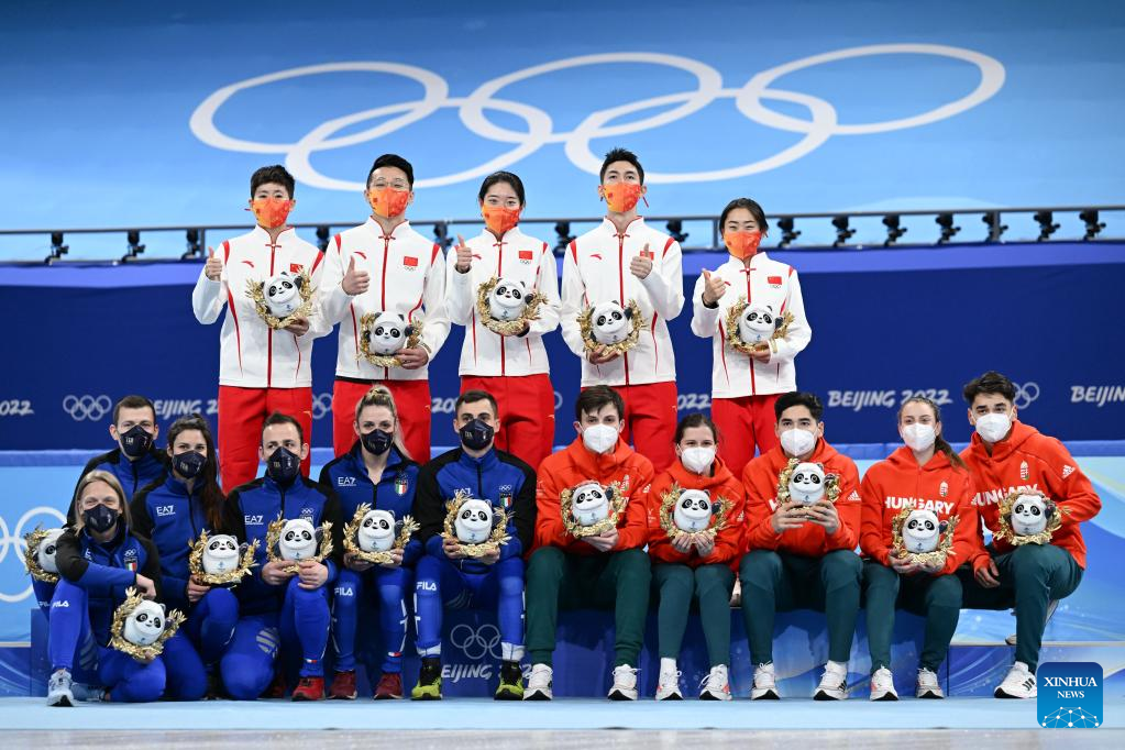 Athletes of China (top), Italy (L, bottom) and Hungary (R, bottom) pose for photos during the flower ceremony after the mixed team relay final of short track speed skating at the Capital Indoor Stadium in Beijing, China, Feb. 5, 2022. (Xinhua/Ju Huanzong)