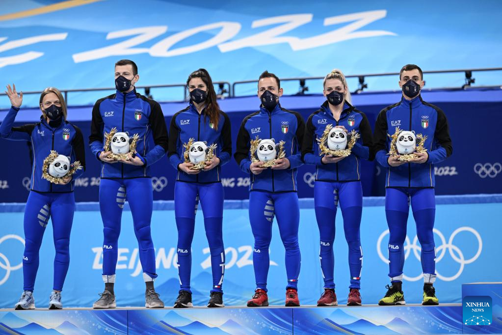 Athletes of Italy pose for photos during the flower ceremony after the mixed team relay final of short track speed skating at the Capital Indoor Stadium in Beijing, China, Feb. 5, 2022. (Xinhua/Ju Huanzong)