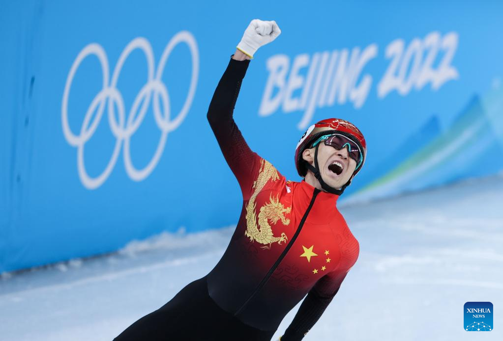 Wu Dajing of China celebrates after the mixed team relay final of short track speed skating at Capital Indoor Stadium in Beijing, China, Feb. 5, 2022. (Xinhua/Yang Lei)