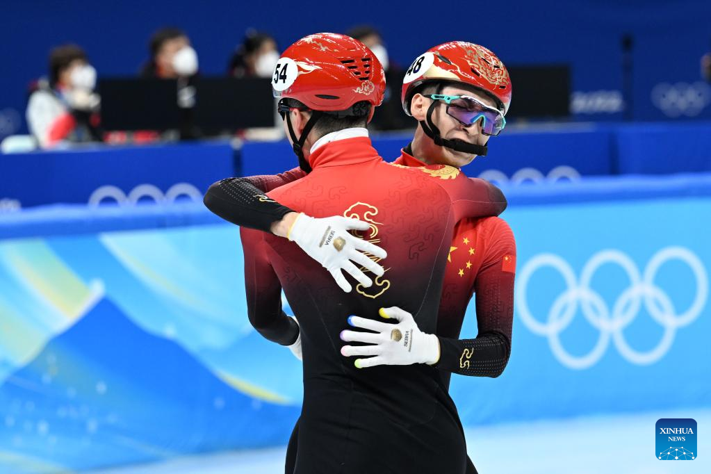Wu Dajing (R) and Ren Ziwei of China celebrate after winning the mixed team relay final of short track speed skating at the Capital Indoor Stadium in Beijing, China, Feb. 5, 2022. (Xinhua/Ju Huanzong)