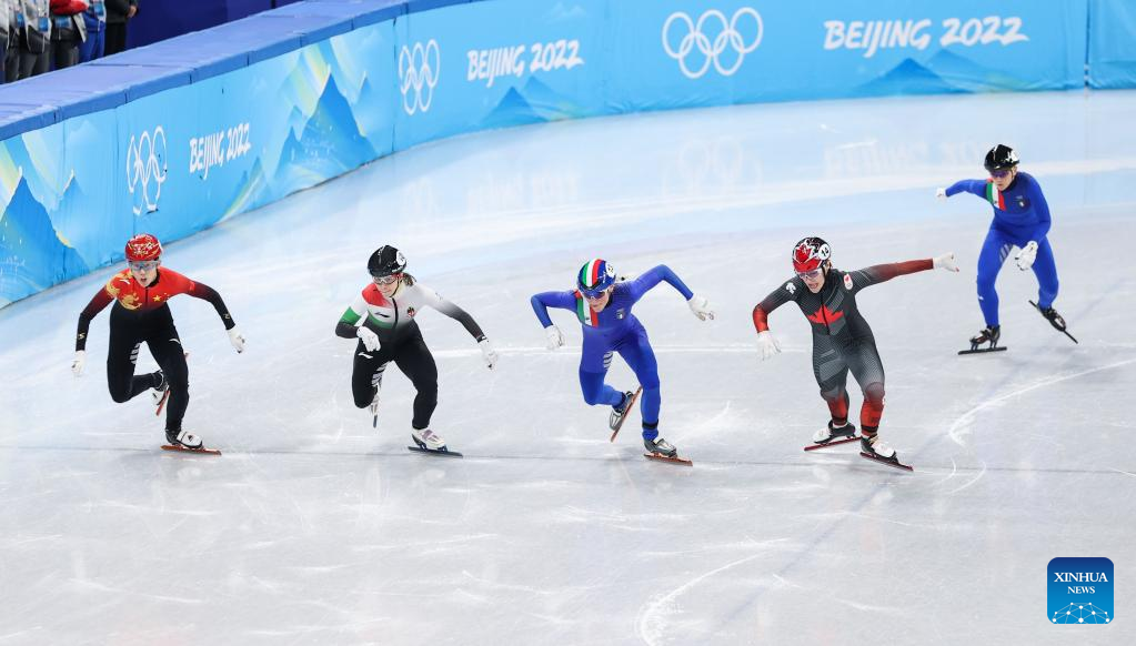 Athletes compete during the mixed team relay final of short track speed skating at Capital Indoor Stadium in Beijing, China, Feb. 5, 2022. (Xinhua/Yang Lei)