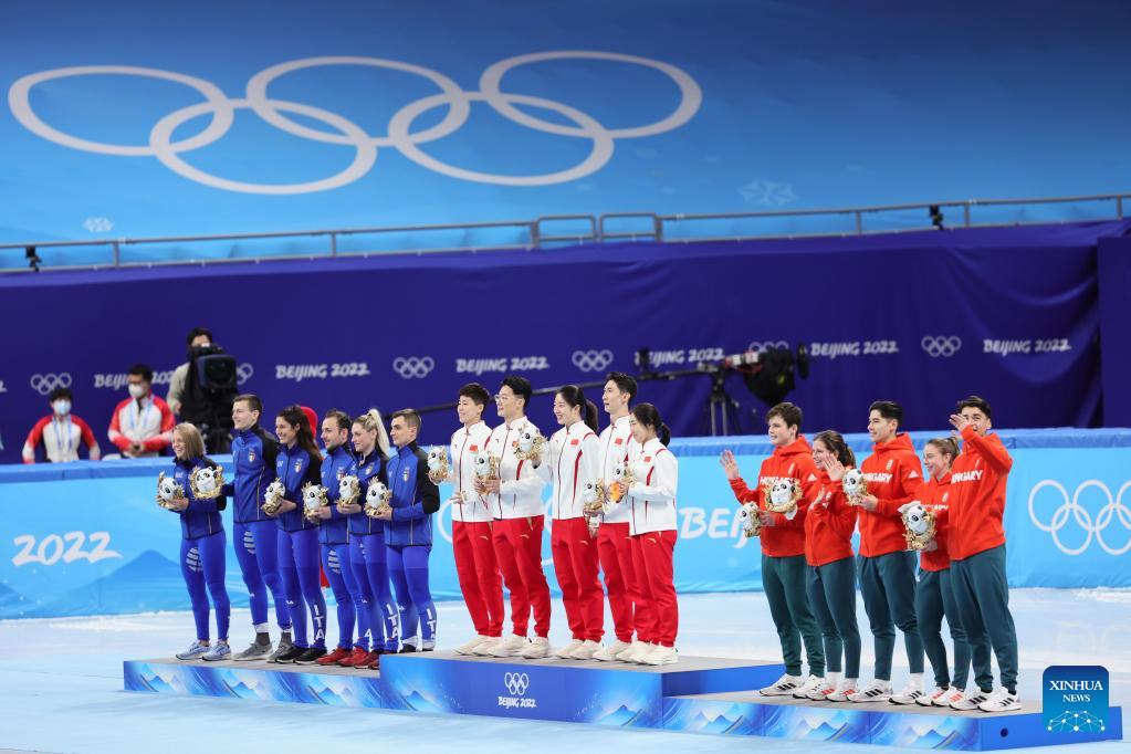 Athletes of China (C), Italy (L) and Hungary (R) pose for photos during the flower ceremony after the mixed team relay final of short track speed skating at the Capital Indoor Stadium in Beijing, China, Feb. 5, 2022. (Xinhua/Lan Hongguang)
