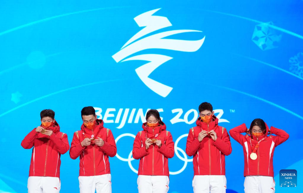 Gold medalists Fan Kexin (1st L), Ren Ziwei (2nd L), Qu Chunyu (C), Wu Dajing (2nd R) and Zhang Yuting of China celebrate during the awarding ceremony of the mixed team relay of short track speed skating event at the Beijing Medals Plaza of the Winter Olympics in Beijing, capital of China, Feb. 6, 2022. (Xinhua/Ju Huanzong)
