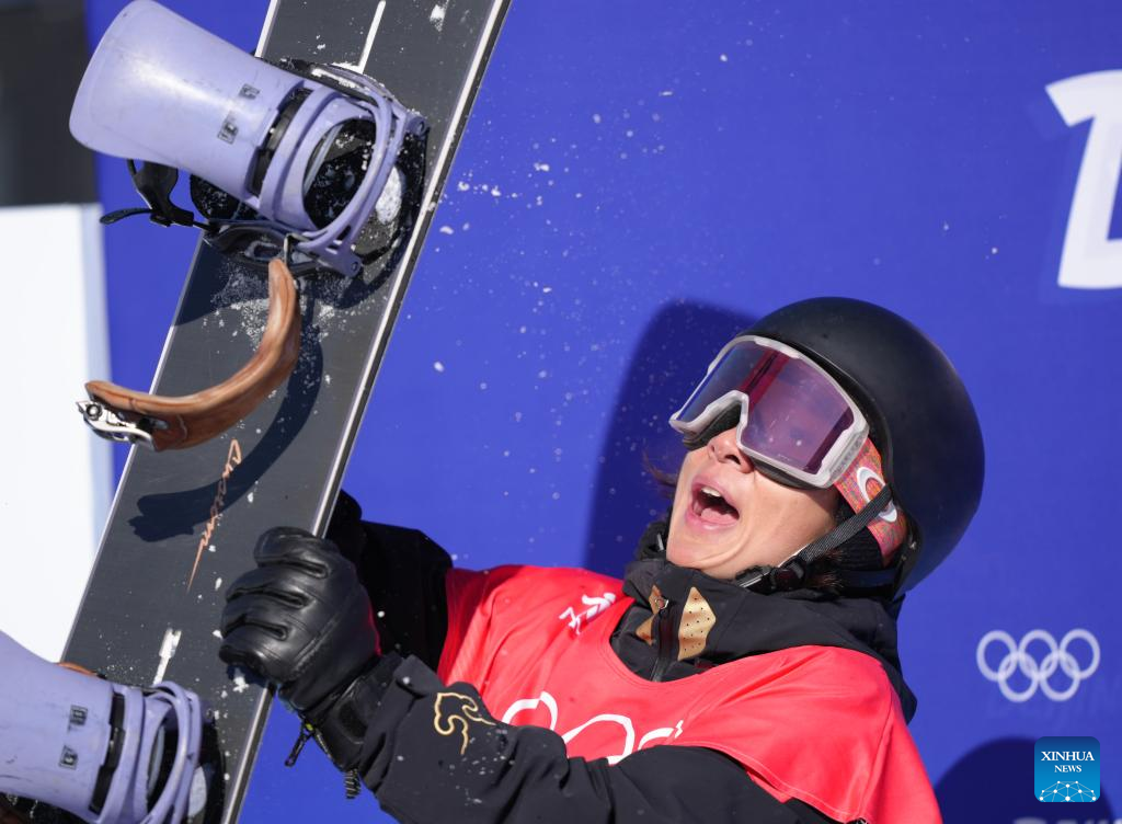 Jamie Anderson of the United States competes during the women's snowboard slopestyle final at the Genting Snow Park in Zhangjiakou, north China's Hebei Province, Feb. 6, 2022. (Xinhua/Fei Maohua)