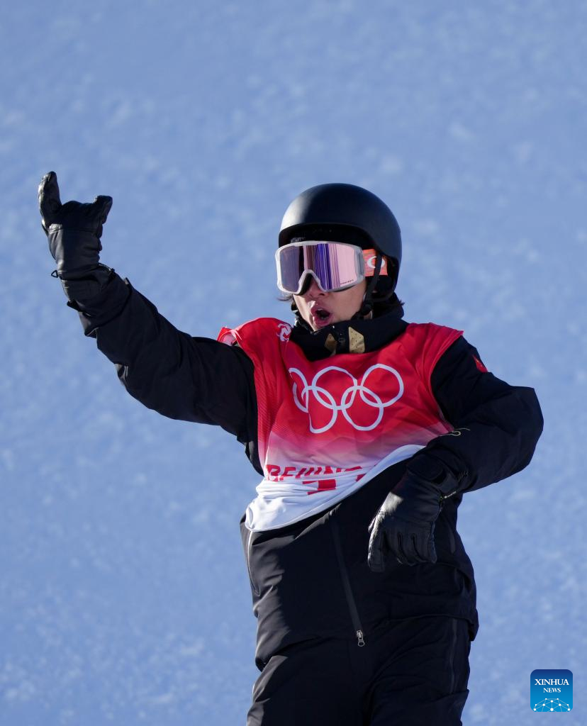 Su Yiming of China celebrates after finishing run one during the men's snowboard slopestyle qualification match at Genting Snow Park in Zhangjiakou, north China's Hebei Province, Feb. 6, 2022. (Xinhua/Xue Yubin)
