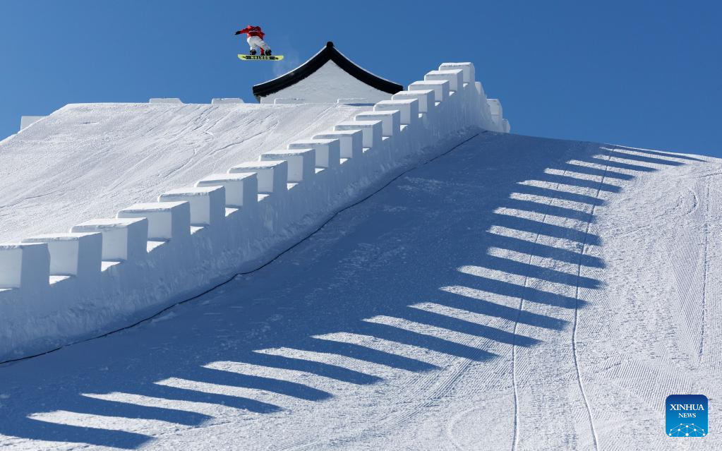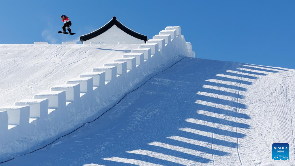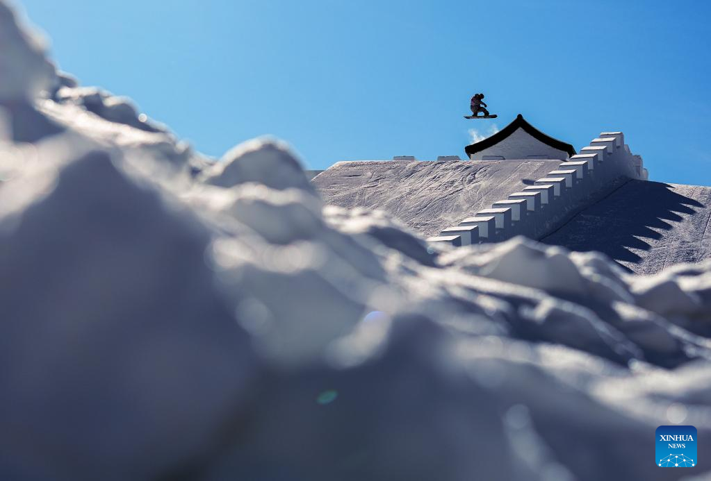 Su Yiming of China competes during the men's snowboard slopestyle qualification match at Genting Snow Park in Zhangjiakou, north China's Hebei Province, Feb. 6, 2022. (Xinhua/Xue Yubin)
