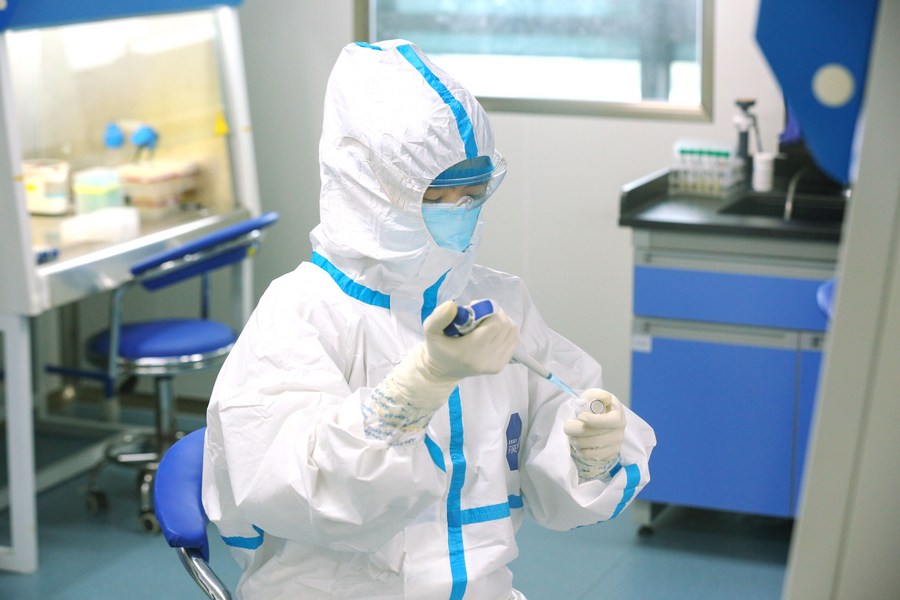 A staff member of Guangdong Hybribio Biotech Co., Ltd. conducts experiments on COVID-19 testing at a laboratory in south China's Guangdong Province, in February, 2020. (Xinhua)