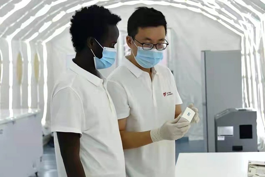 A staff member (R) of BGI Genomics provides training for an Ethiopian employee at a COVID-19 test kits production plant in Ethiopia, in November, 2020. (Xinhua)