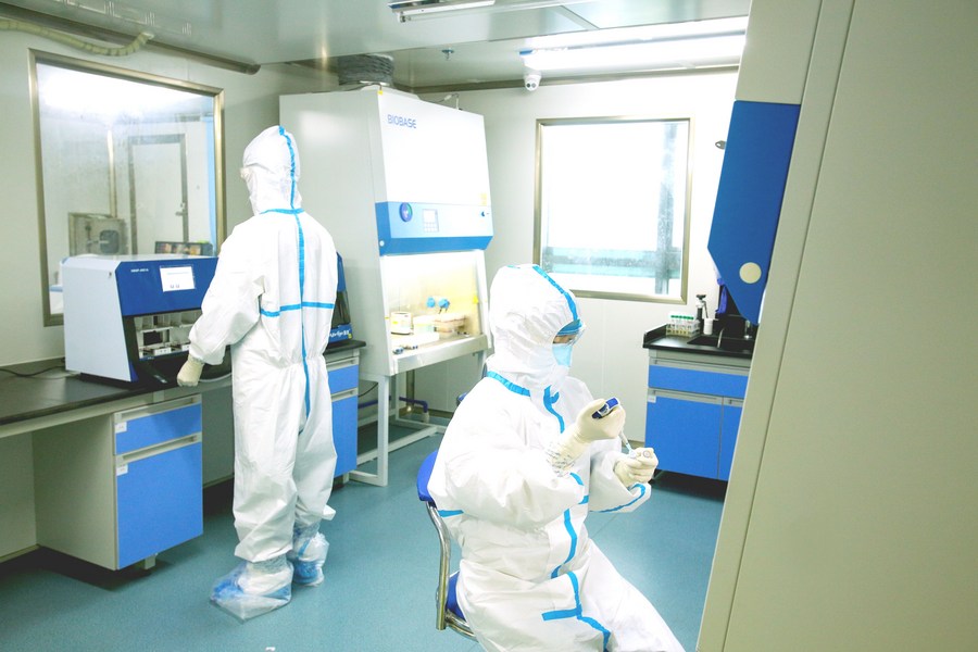 Staff members of Guangdong Hybribio Biotech Co., Ltd. conduct experiments on COVID-19 testing at a laboratory in south China's Guangdong Province, in February, 2020. (Xinhua)