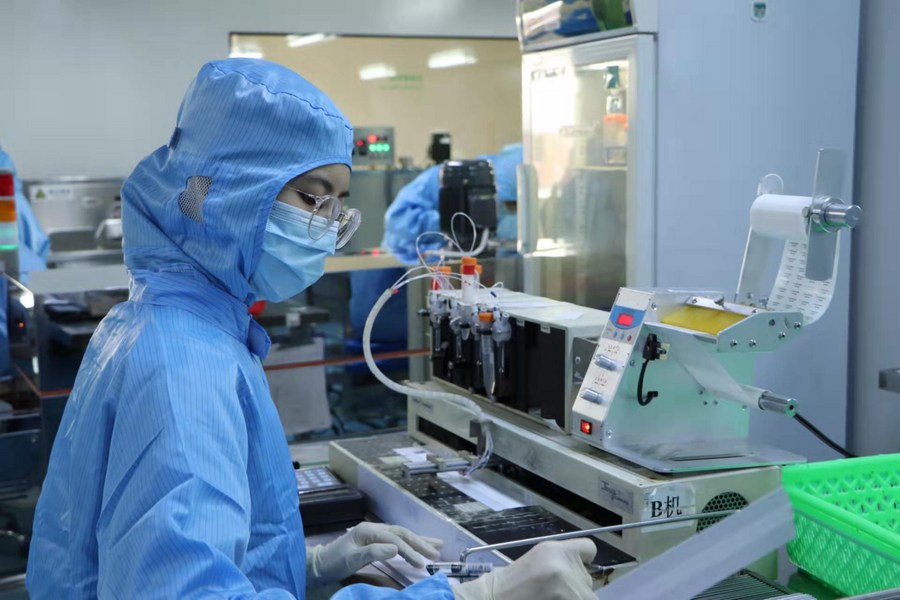 A staff member of Guangzhou Wondfo Biotech Co., Ltd. produces COVID-19 testing kits in south China's Guangdong Province, in June, 2020. (Xinhua)