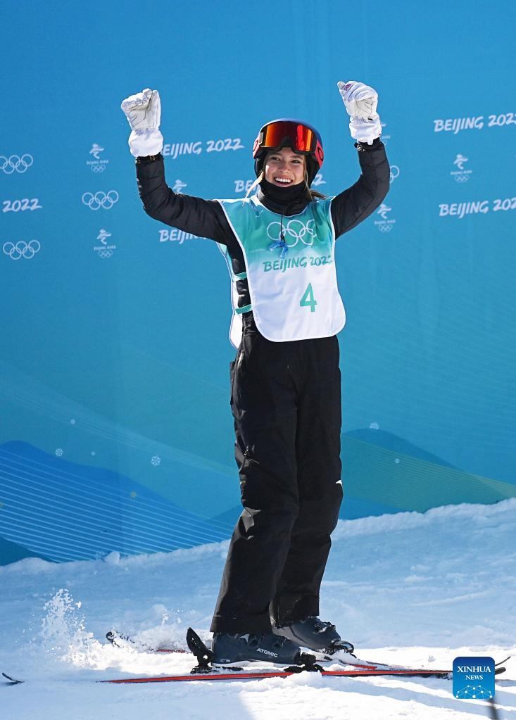 Gu Ailing of China celebrates after the women's freeski big air qualification at Big Air Shougang in Beijing, capital of China, Feb. 7, 2022. (Xinhua/Xiong Qi)