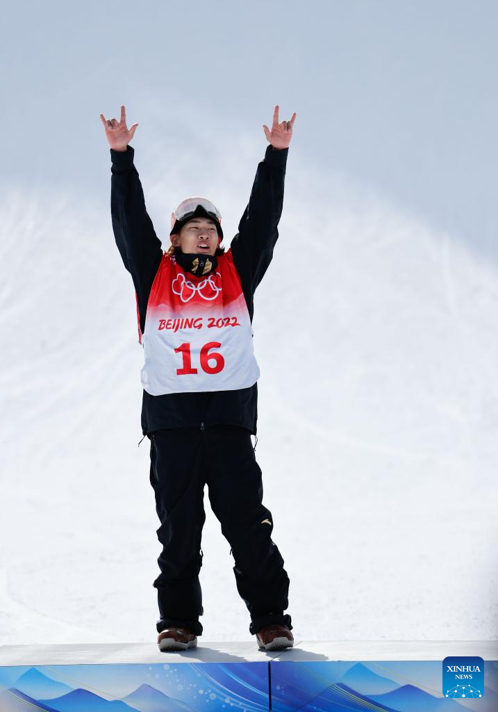 Silver Medalist Su Yiming celebrates after men's snowboard slopestyle final at the Genting Snow Park in Zhangjiakou, north China's Hebei Province, Feb. 7, 2022. (Xinhua/Fei Maohua)