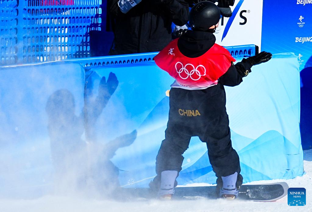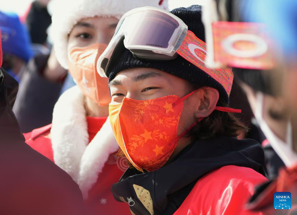 China's Su Yiming reacts after men's snowboard slopestyle final at the Genting Snow Park in Zhangjiakou, north China's Hebei Province, Feb. 7, 2022. (Xinhua/Yang Shiyao)