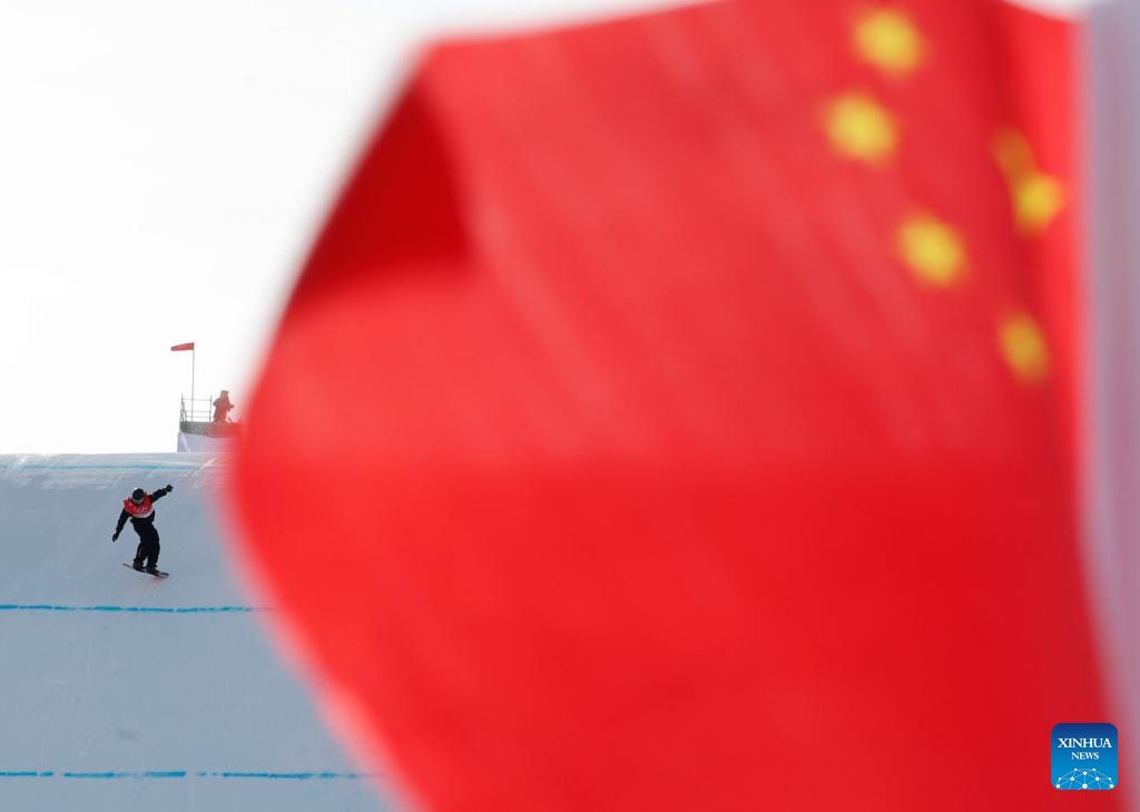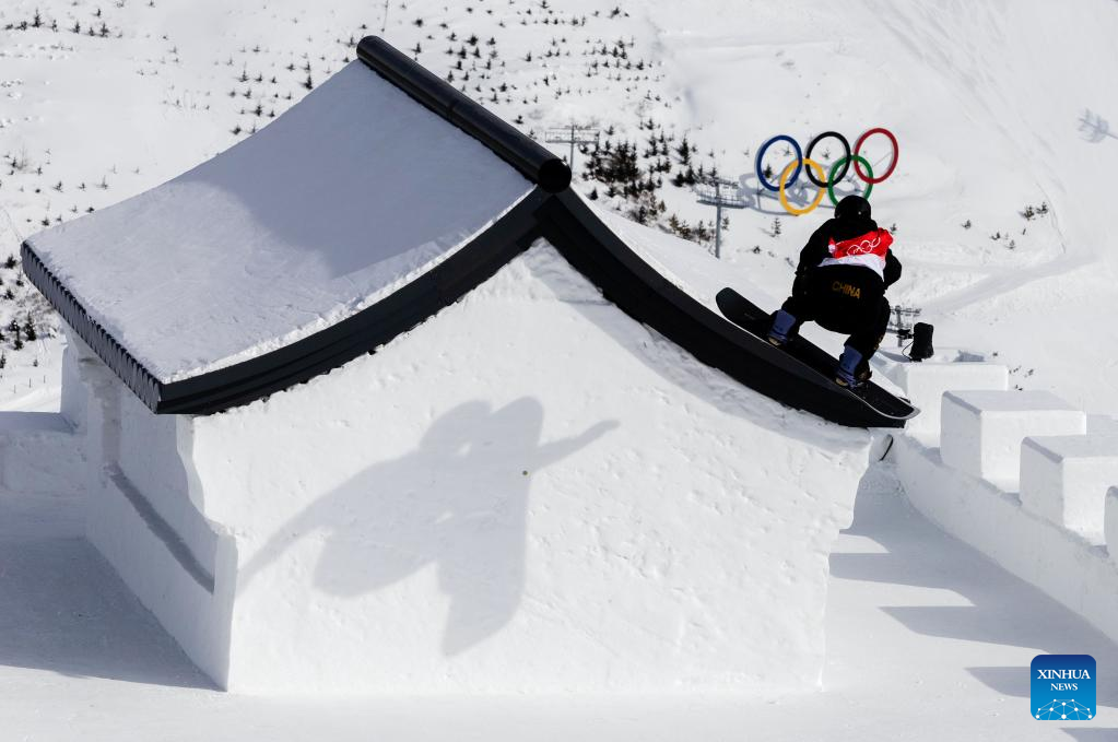 China's Su Yiming takes part in training prior to men's snowboard slopestyle final at the Genting Snow Park in Zhangjiakou, north China's Hebei Province, Feb. 7, 2022. (Xinhua/Fei Maohua)