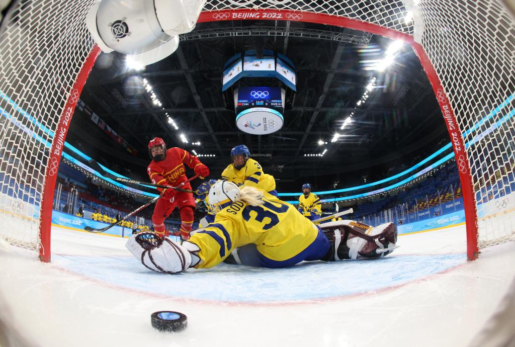 Goalkeeper Emma Soderberg (front) of Sweden misses a goal during the ice hockey women's preliminary round Group B match between China and Sweden at Wukesong Sports Centre in Beijing, capital of China, Feb. 7, 2022. (Xinhua/Song Yanhua)