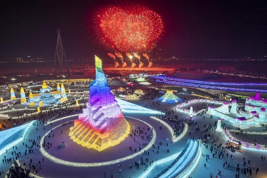 Harbin Ice and Snow World, an ice and snow theme park in Harbin city, northeast China’s Heilongjiang province, stages large-scale fireworks to welcome the New Year, Dec. 31, 2021. (People’s Daily Online/Yin Chengying)