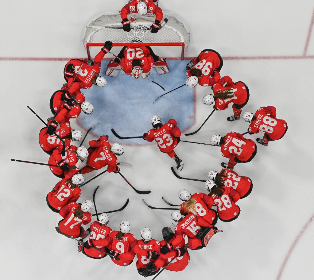 Athletes of Switzerland gather before the start of ice hockey women's Group A match between Switzerland and Finland at National Indoor Stadium in Beijing, capital of China, Feb. 7, 2022. (Xinhua/Du Yu)