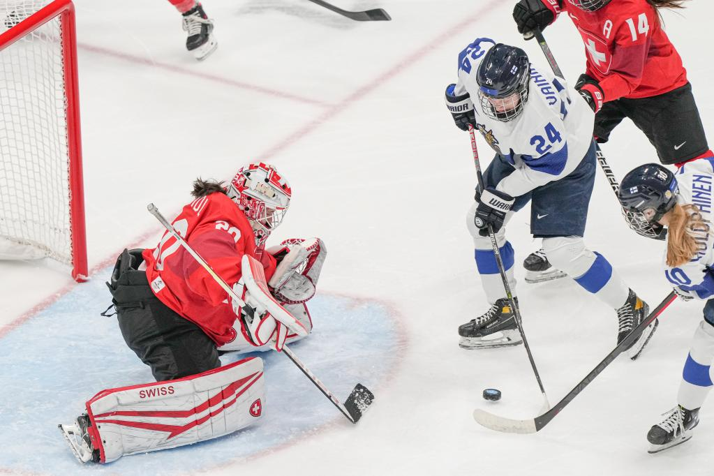 Viivi Vainikka (2nd L) of Finland shoots during the ice hockey women's Group A match between Switzerland and Finland at National Indoor Stadium in Beijing, capital of China, Feb. 7, 2022. (Xinhua/Du Yu)