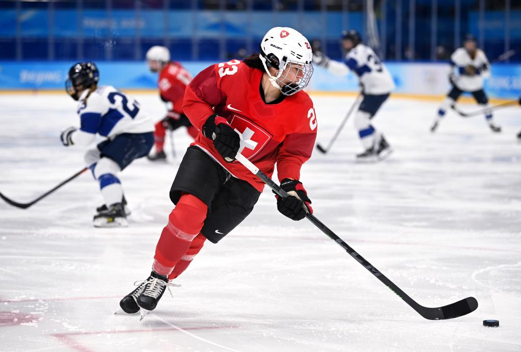 Nicole Bullo of Switzerland controls the puck during the ice hockey women's Group A match between Switzerland and Finland at National Indoor Stadium in Beijing, capital of China, Feb. 7, 2022. (Xinhua/Li Ziheng)