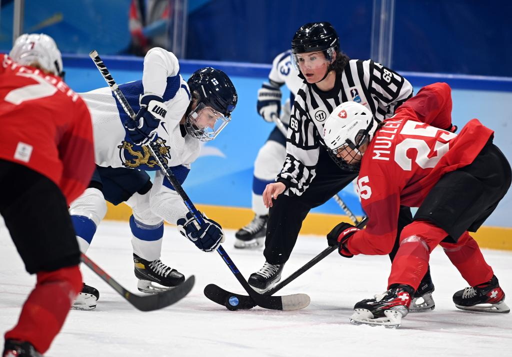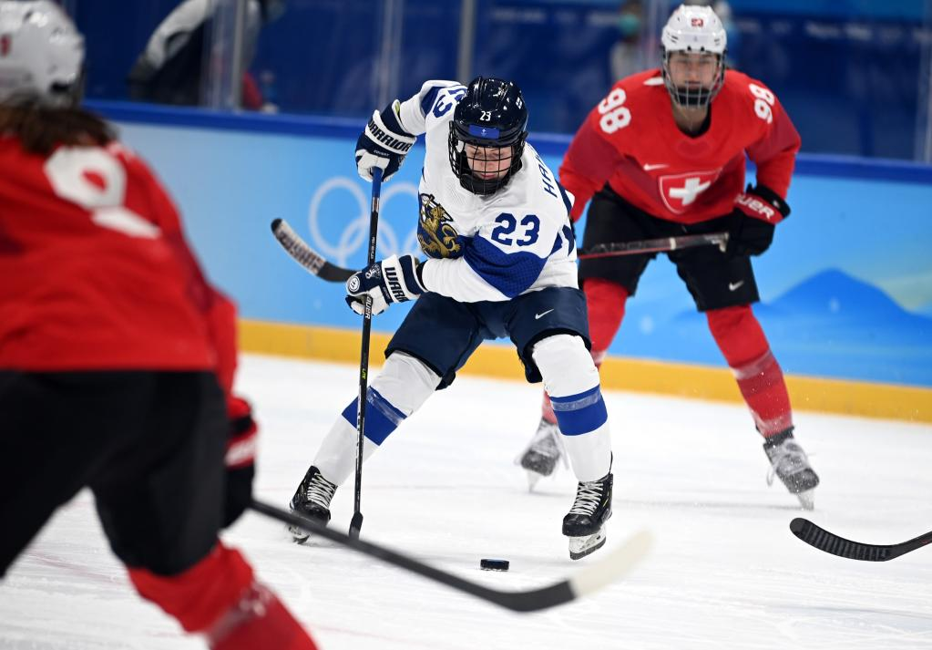 Sanni Hakala (C) of Finland competes during the ice hockey women's Group A match between Switzerland and Finland at National Indoor Stadium in Beijing, capital of China, Feb. 7, 2022. (Xinhua/Li Ziheng)