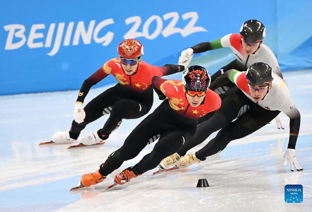 Ren Ziwei of China (front) competes during the men's 1000m final of short track speed skating at Capital Indoor Stadium in Beijing, capital of China, Feb. 7, 2022. (Xinhua/Xiong Qi)
