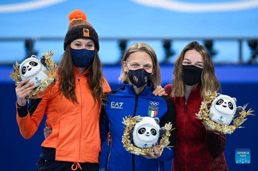 Arianna Fontana (C) of Italy, Suzanne Schulting (L) of the Netherlands and Kim Boutin of Canada attend the flower ceremony after the women's 500m final of short track speed skating at Capital Indoor Stadium in Beijing, capital of China, Feb. 7, 2022. (Xinhua/Ju Huanzong)