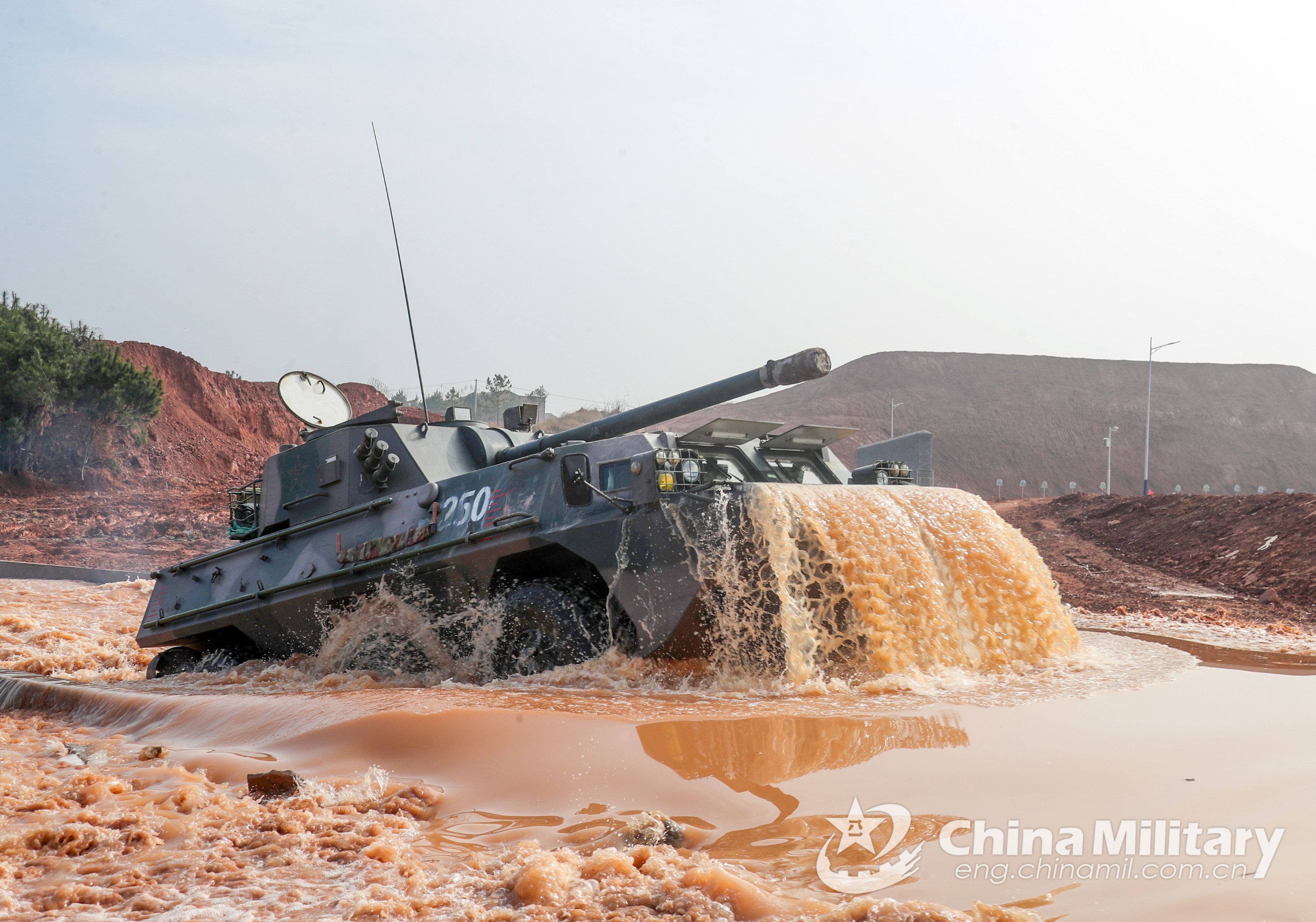 A self-propelled mortar-howitzer system attached to the PLA 72nd Group Army wades through a water obstacle during the driving training course on January 22, 2022. (eng.chinamil.com.cn/Photo by Zhang Mao)