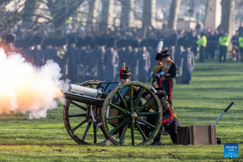 Members of the King's Troop Royal Horse Artillery fire a gun salute to mark Queen Elizabeth II's 70th anniversary of her accession to the throne at Green Park in London, Britain, on Feb. 7, 2022. (Photo by Ray Tang/Xinhua)