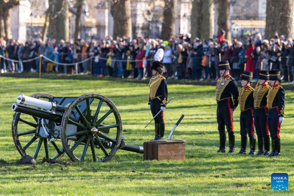 Members of the King's Troop Royal Horse Artillery take part in a gun salute to mark Queen Elizabeth II's 70th anniversary of her accession to the throne at Green Park in London, Britain, on Feb. 7, 2022. (Photo by Ray Tang/Xinhua)