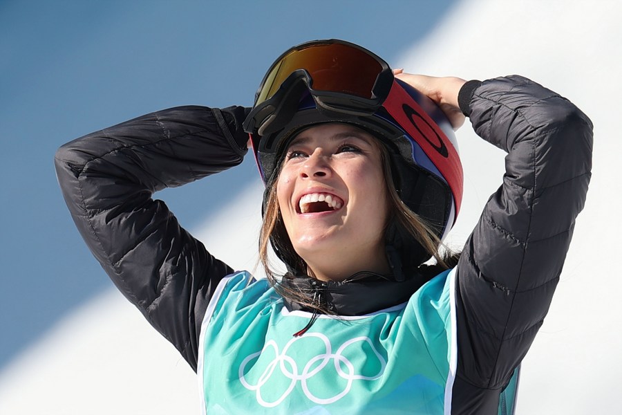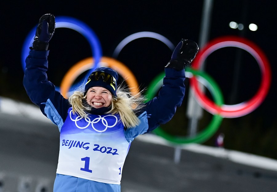 Jonna Sundling of Sweden celebrates after winning gold in the women's cross-country skiing sprint free final at Zhangjiakou National Cross-country Skiing Center. (Xinhua/Zhang Hongxiang)
