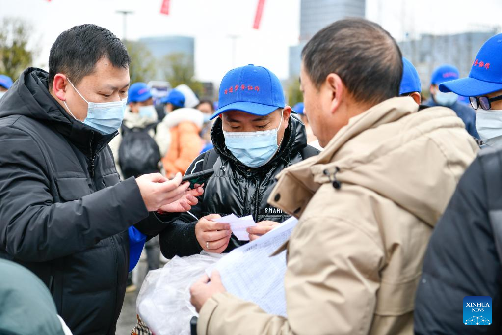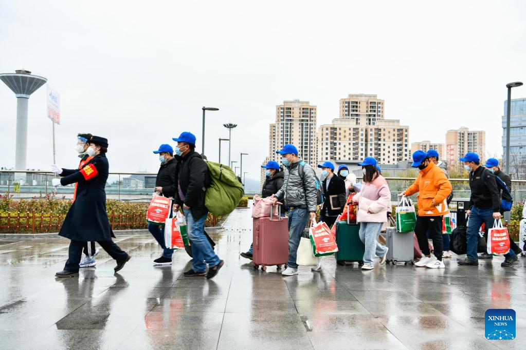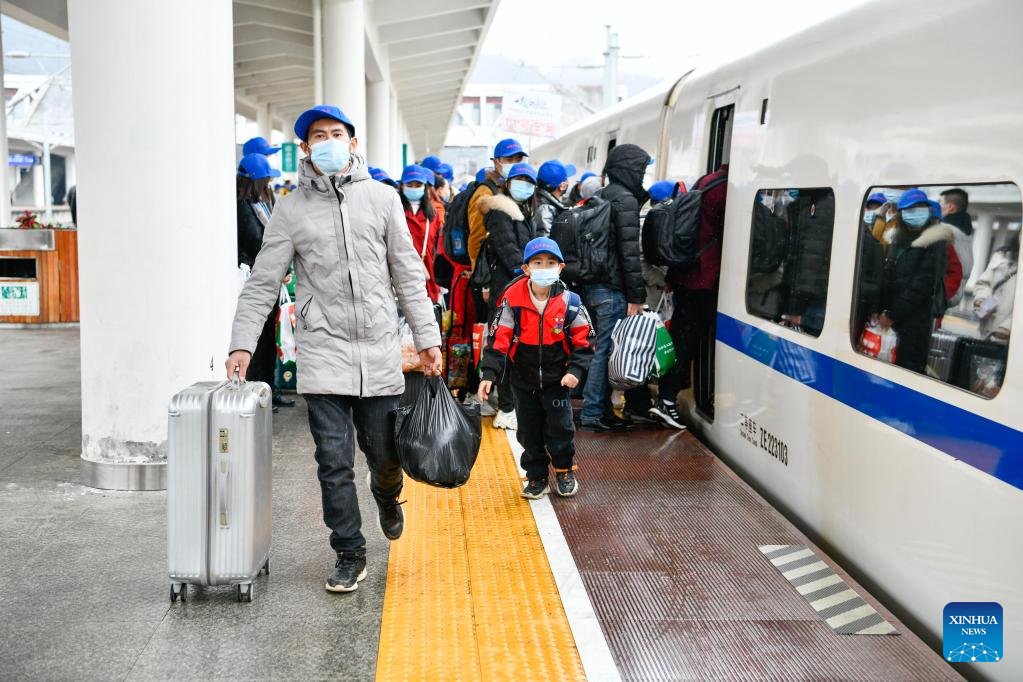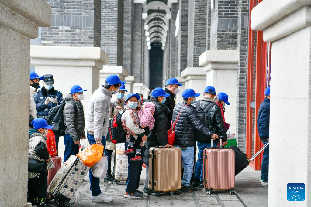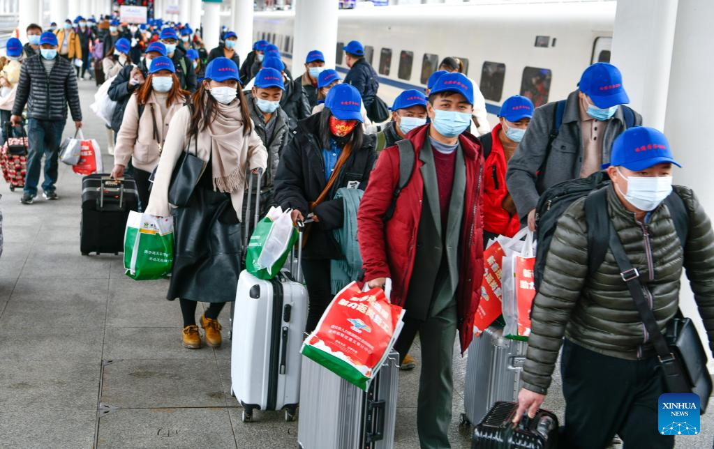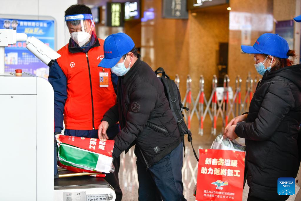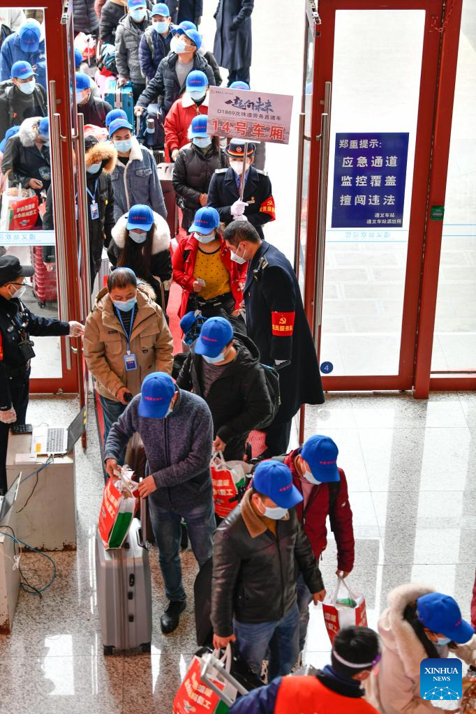 Migrant workers are seen at Zunyi Station in Zunyi, southwest China's Guizhou Province, Feb. 8, 2022. A special train free of charge for migrant workers who are about to return to work left Zunyi Station in Guizhou Province on Tuesday for Guangzhou and Zhuhai in east China's Guangdong Province. It is the first such train for returning workers in Guizhou this year. More than 600 migrant workers here took the train. (Xinhua/Yang Wenbin)