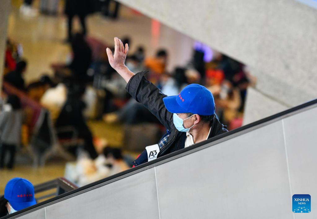 A migrant worker returning to work waves goodbye to his relatives at Zunyi Station in Zunyi, southwest China's Guizhou Province, Feb. 8, 2022. A special train free of charge for migrant workers who are about to return to work left Zunyi Station in Guizhou Province on Tuesday for Guangzhou and Zhuhai in east China's Guangdong Province. It is the first such train for returning workers in Guizhou this year. More than 600 migrant workers here took the train. (Xinhua/Yang Wenbin)