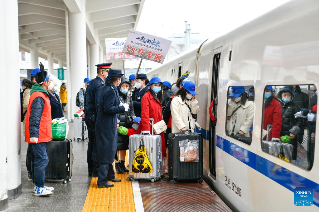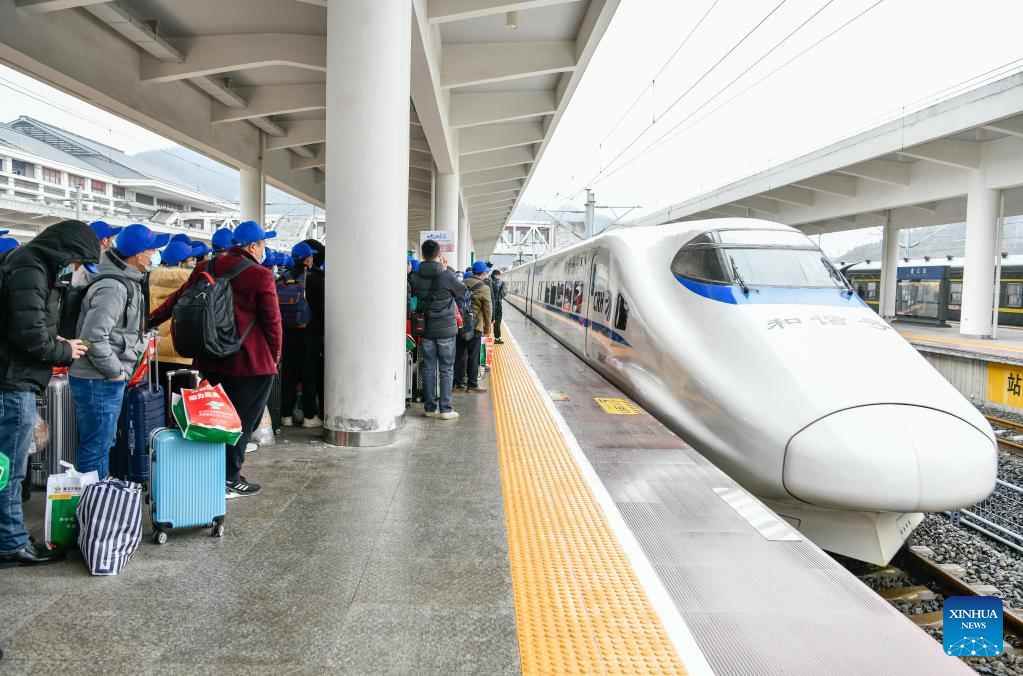 A special train for migrant workers arrives at Zunyi Station in Zunyi, southwest China's Guizhou Province, Feb. 8, 2022. A special train free of charge for migrant workers who are about to return to work left Zunyi Station in Guizhou Province on Tuesday for Guangzhou and Zhuhai in east China's Guangdong Province. It is the first such train for returning workers in Guizhou this year. More than 600 migrant workers here took the train. (Xinhua/Yang Wenbin)