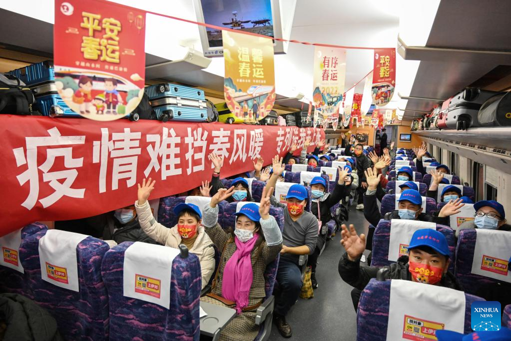 Migrant workers are seen on a special train at Zunyi Station in Zunyi, southwest China's Guizhou Province, Feb. 8, 2022. A special train free of charge for migrant workers who are about to return to work left Zunyi Station in Guizhou Province on Tuesday for Guangzhou and Zhuhai in east China's Guangdong Province. It is the first such train for returning workers in Guizhou this year. More than 600 migrant workers here took the train. (Photo by Bao Liang/Xinhua)