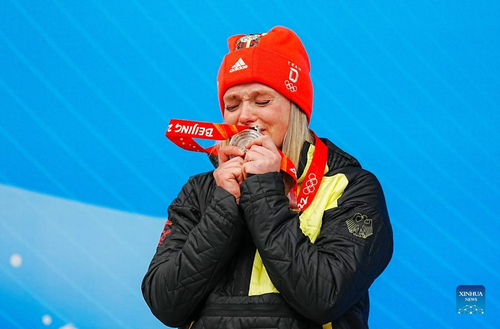 Silver medallist Anna Berreiter of Germany celebrates during the awarding ceremony after women's singles run of luge event at the Yanqing National Sliding Centre in Yanqing district of Beijing, capital of China, Feb. 8, 2022. (Xinhua/Jiang Wenyao)