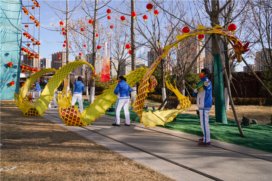 Zhangjiakou citizens exercise in the Industrial Culture Theme Park by wielding a long whip attached to a "yellow cloth dragon", which flutters in the air as it is swung in various patterns. The device is called a "bodybuilding dragon" and is popular among older people. [Photo by Xu Lin/China Daily]